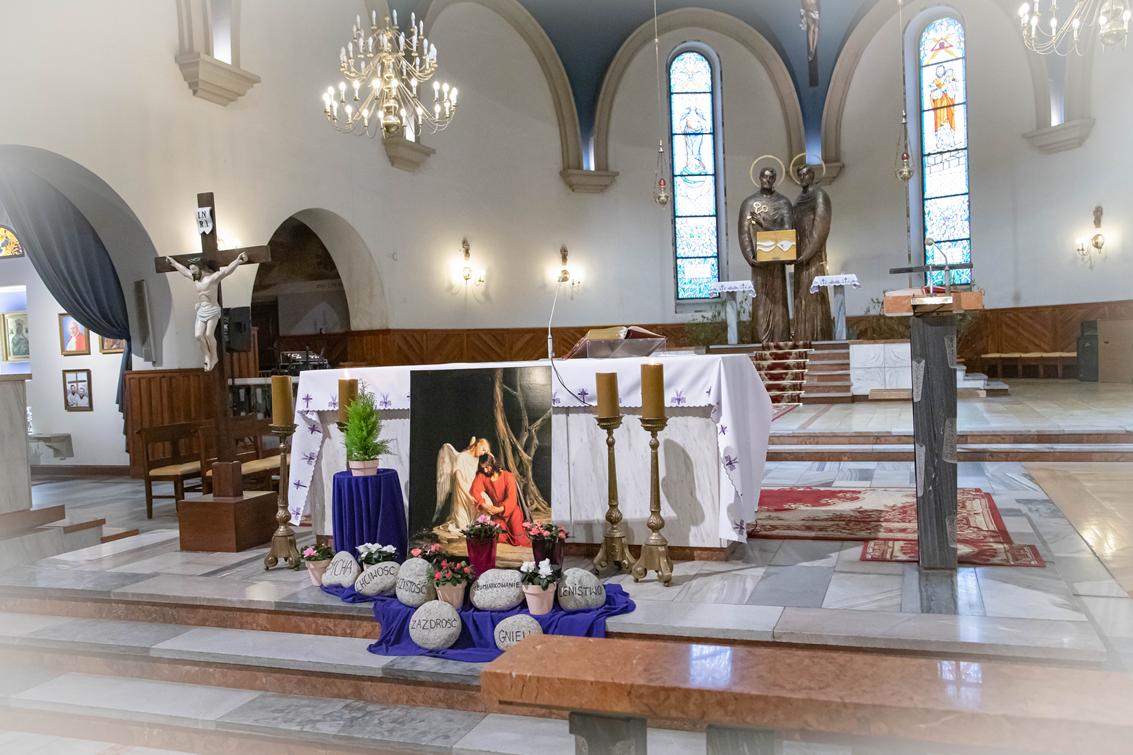Przy ołtarzu pojawiły się duże kamienie z wypisanymi siedmioma grzechami głównymi. Całość uzupełnia odpowiednia kolorystyka użytych materiałów oraz replika obrazu Carla Blocha pt. „Modlitwa Pana Jezusa w Ogrójcu”.