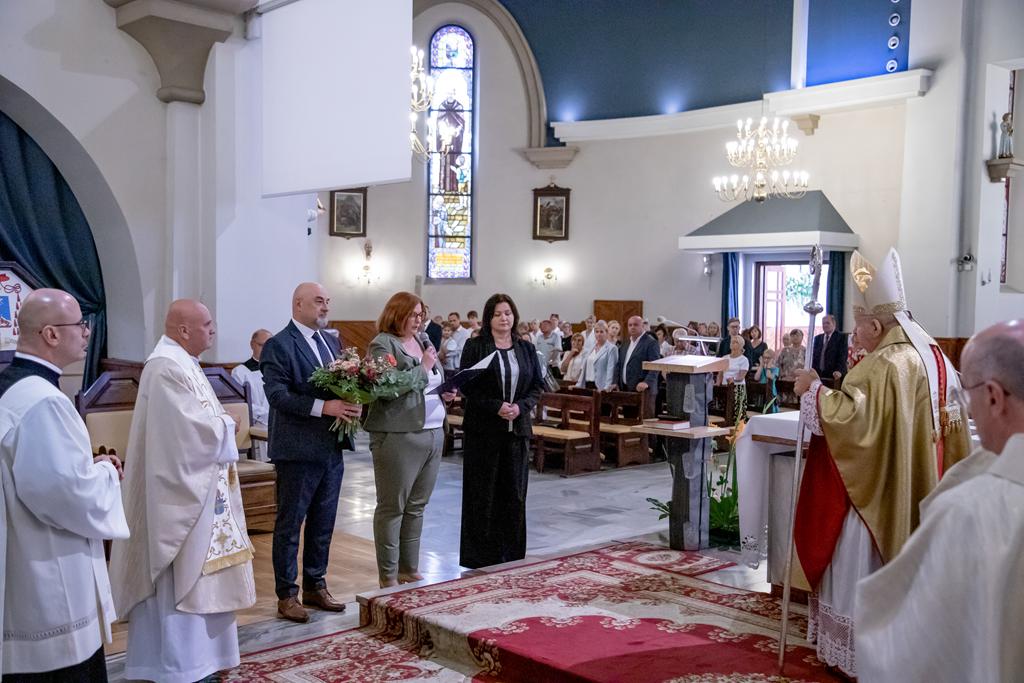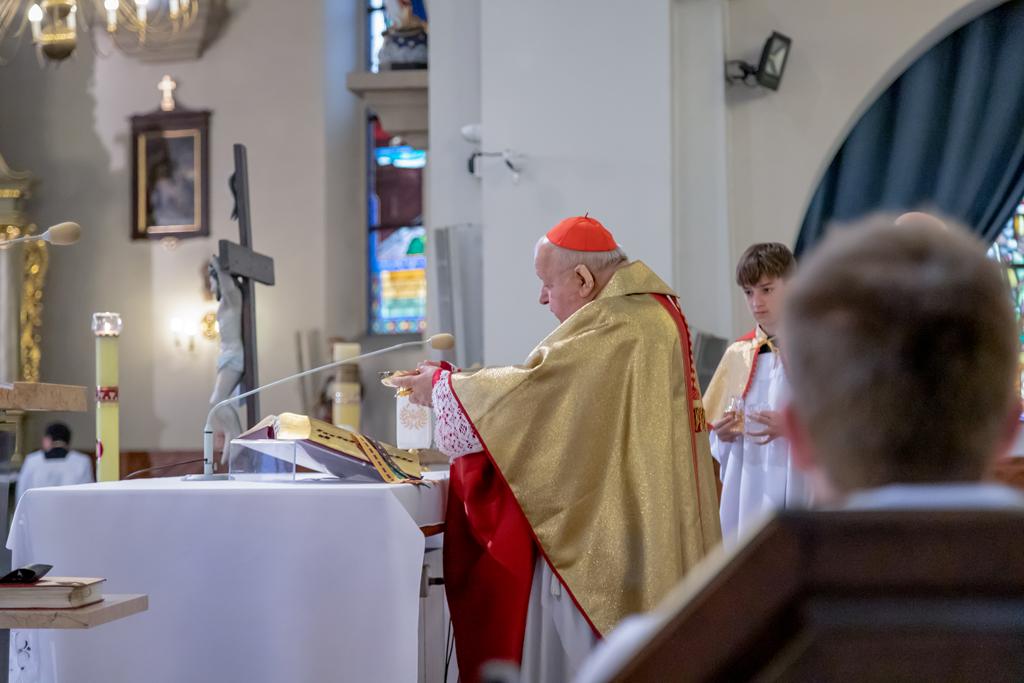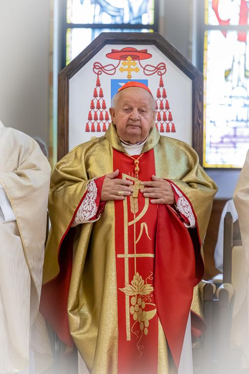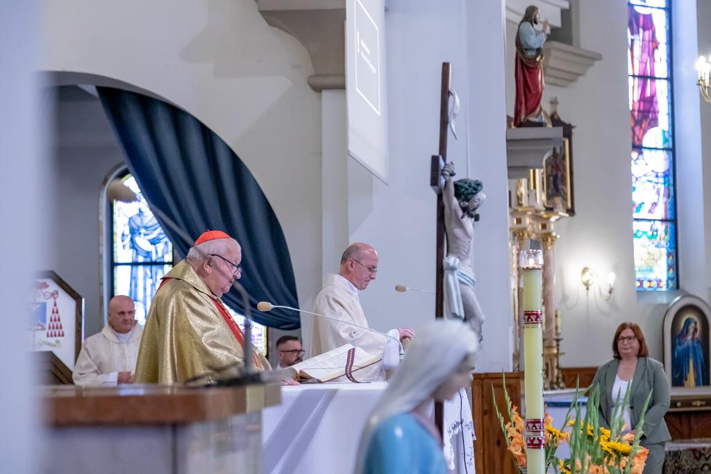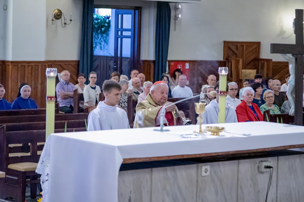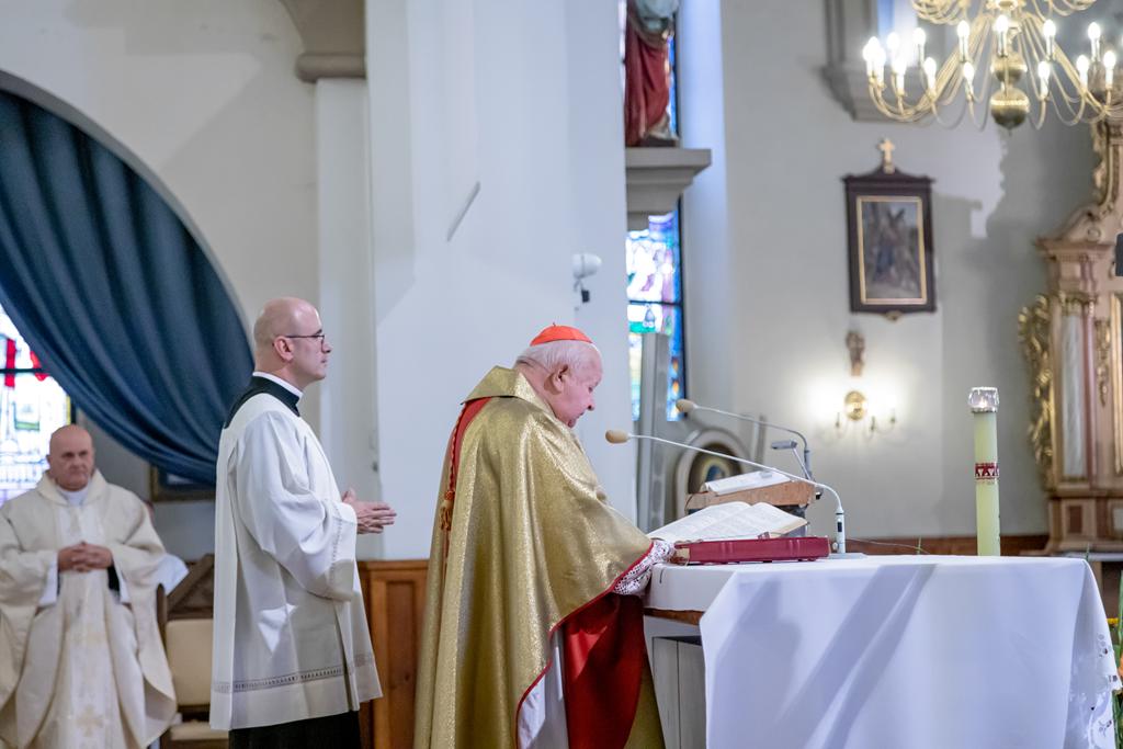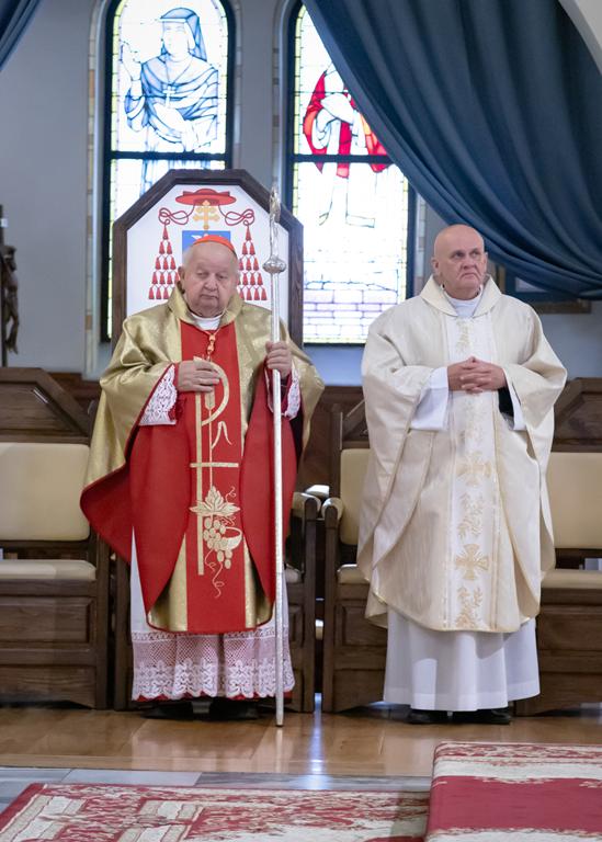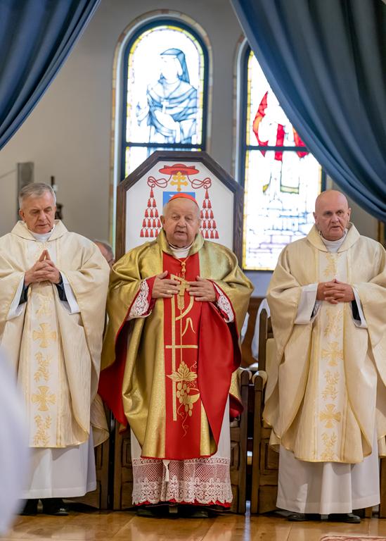 We wspólnej modlitwie wzięli udział przedstawiciele władz samorządowych, dyrektorzy szkół i przedszkoli, reprezentacja Straży Pożarnej, Siostry Zakonne pochodzące z naszej parafii, jak i te, które tutaj pracowały oraz Parafianie i Goście. W imieniu całej wspólnoty Rada Parafialna podziękowała ks. Kardynałowi za modlitwę w intencji naszej parafii. Na zakończenie liturgii ks. Kardynał poświęcił dwa nowe witraże, które powstały jako pamiątka Roku Jubileuszowego. Świąteczną liturgię ubogacił swoim śpiewem zespół muzyczny "Boski Squad".
